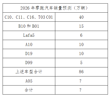 客观来讲,我对2025年及之前上市车型在今年的销量预测是谨慎乐观的,而对于今年已上市或将上市车型中的A10、D19、D99和Lafa5 Ultra在今年的销量预测甚至是乐观的。因此,针对上述车型合计约86万辆的预测还是比较乐观,悲观的话可能在75万辆左右。而真正决定零跑汽车能否有机会实现目标的车型就是将于今年6-7月上市的零跑A05。